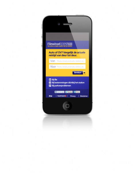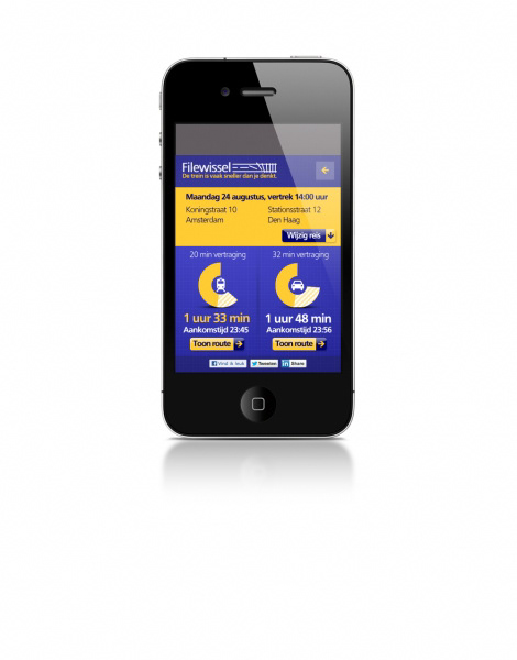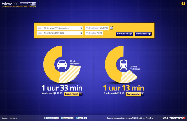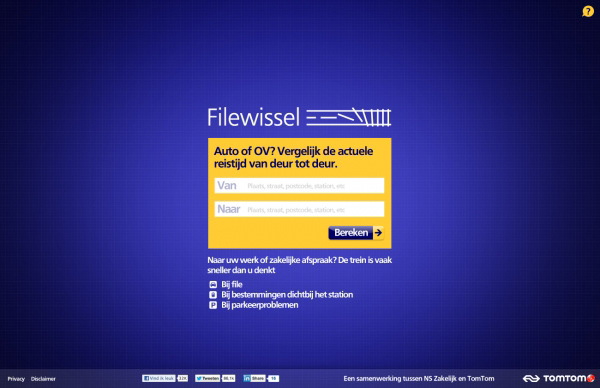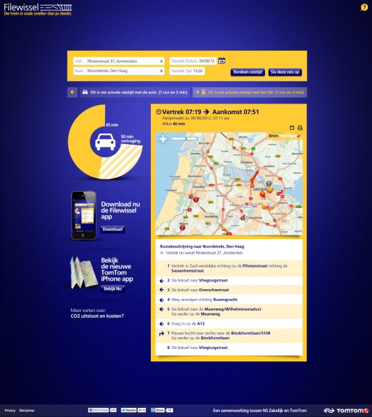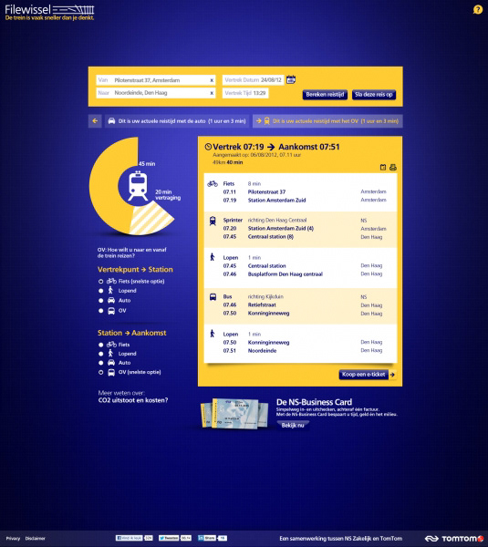 NS Filewissel is een online tool waarmee live, actueel wordt berekend wat sneller is op dat moment, de auto of de trein. Van deur tot deur, dus inclusief tocht naar het station, evt. vertraging, en files. Vaak is de auto sneller, maar voor mensen die dicht bij het station wonen heel interessant, want in de spits scheelt het vaak veel tijd. Hulde aan de klant, die heel open durft te zijn en toegeeft dat de auto af en toe sneller is. Een technisch hoogstandje: met live treinreis- en verkeersinformatie van TomTom en OV9292. Gemaakt met met Job, Maarten, Michiel en Billy.